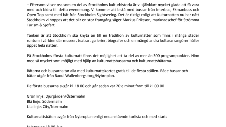 – Eftersom vi ser oss som en del av Stockholms kulturhistoria är vi självklart mycket glada att få vara med och bidra till detta evenemang. Vi kommer att bistå med bussar från Interbus, Ekmanbuss och Open Top samt med båt från Stockholm Sightseeing. Det är riktigt roligt att Kulturnatten nu har nått Stockholm vi hoppas att det blir en stor framgång säger Markus Eriksson, marknadschef för Strömma Turism & Sjöfart.