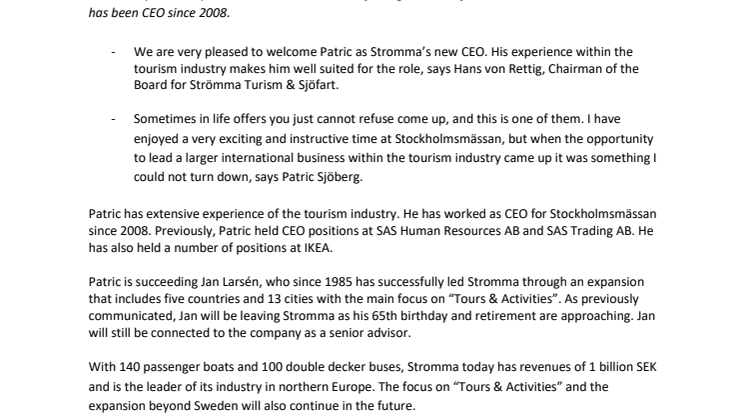 - We are very pleased to welcome Patric as Stromma’s new CEO. His experience within the tourism industry makes him well suited for the role, says Hans von Rettig, Chairman of the Board for Strömma Turism & Sjöfart.