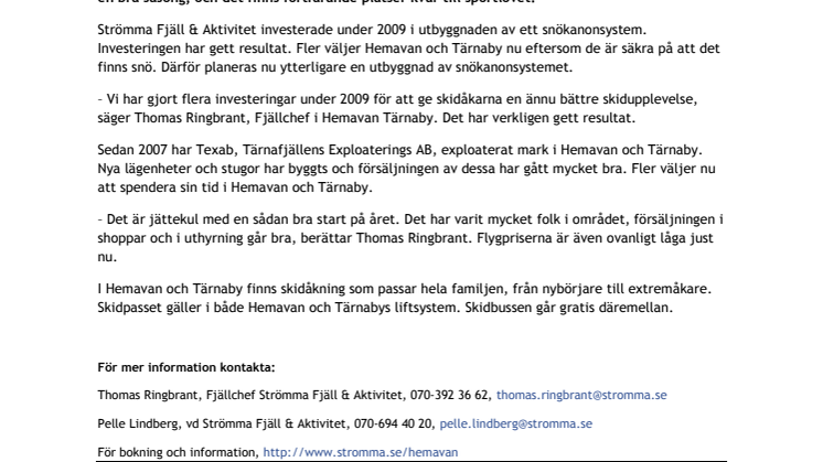 Strömma Fjäll & Aktivitet investerade under 2009 i utbyggnaden av ett snökanonsystem. Investeringen har gett resultat. Fler väljer Hemavan och Tärnaby nu eftersom de är säkra på att det finns snö. Därför planeras nu ytterligare en utbyggnad av snökanonsystemet.
