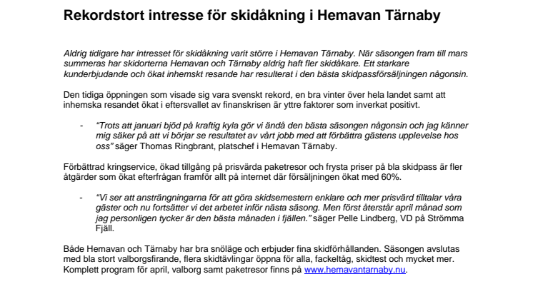 - “Trots att januari bjöd på kraftig kyla gör vi ändå den bästa säsongen någonsin och jag känner mig säker på att vi börjar se resultatet av vårt jobb med att förbättra gästens upplevelse hos oss” säger Thomas Ringbrant, platschef i Hemavan Tärnaby.
