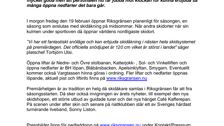”Vi har ett fantastiskt snöläge och kan erbjuda skidåkning i nästan hela skidsystemet på premiärdagen. Det officiella snödjupet är 120 cm vilket är störst i landet” säger platschef Torbjörn Utsi.