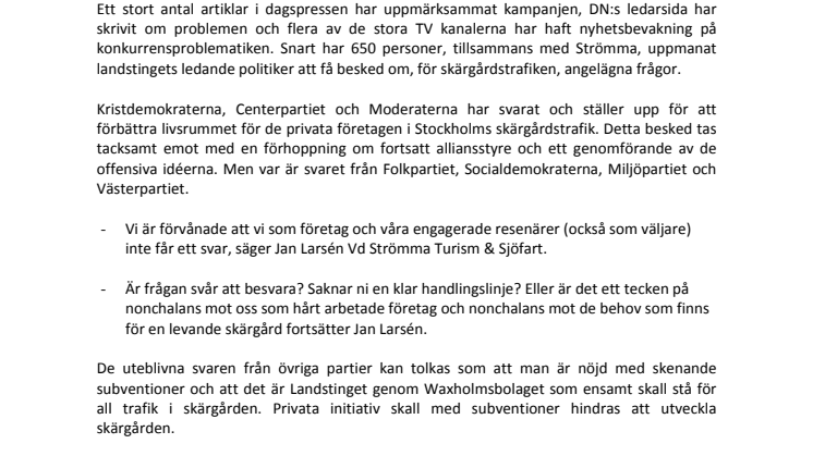 Kristdemokraterna, Centerpartiet och Moderaterna har svarat och ställer upp för att förbättra livsrummet för de privata företagen i Stockholms skärgårdstrafik. Detta besked tas tacksamt emot med en förhoppning om fortsatt alliansstyre och ett genomförande av de offensiva idéerna. Men var är svaret från Folkpartiet, Socialdemokraterna, Miljöpartiet och Västerpartiet.