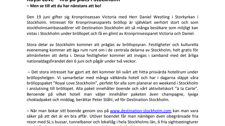 – Det stora intresset har gjort att det kommer bli svårt att hitta prisvärda hotellrum under bröllopshelgen. Vi samarbetar med många välkända hotell och har i dagarna släppt våra bröllopspaket ”Royal Love Stockholm”, perfekt för alla som planerar en weekend i Stockholm i anslutning till bröllopet. Alla paket innehåller boende och vårt aktivitetskort ”à la Carte”. Beroende på vilket hotell man väljer innehåller paketen även champagne, lyxiga chokladpaket och middag, berättar Peter Ståhl, vd för Destination Stockholm.