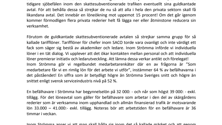 Den strejk bland SACO-förbundet Sjöbefälsföreningen som nu brutit ut drabbar i vanlig ordning oskyldiga, som inte är grunden för konflikten. De strejkande sjöbefälen strejkar för att uppnå fördelar efter den skandalomsusade skärgårdsupphandlingen som just slutförts i Stockholm. I och med att det vinnande bolaget TRSM Group AB har vunnit, så förlorar de tidigare sjöbefälen inom den skattesubventionerade trafiken eventuellt sina guldkantade avtal. För att behålla dessa så strejkar de nu så att alla i hela den privata sektorn skall få likandana avtal. Det innebär en löneökning mot uppemot 15 procent! Om det går igenom kommer förmodligen flera privata rederier helt få lägga ner eller åtminstone reducera sin verksamhet.