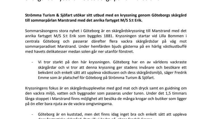 Strömma Turism & Sjöfart utökar sitt utbud med en kryssning genom Göteborgs skärgård till sommarpärlan Marstrand med det anrika fartyget M/S S:t Erik.