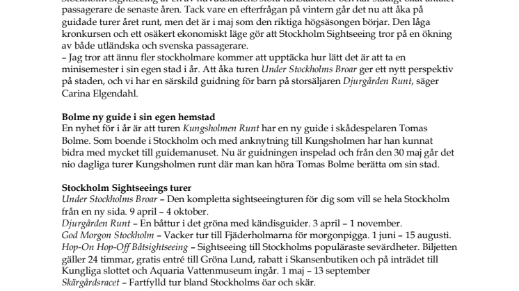 - Jag tror att ännu fler stockholmare kommer att upptäcka hur lätt det är att ta en minisemester i sin egen stad i år. Att åka turen Under Stockholms Broar ger ett nytt perspektiv på staden, och vi har en särskild guidning för barn på storsäljaren Djurgården Runt, säger Carina Elgendahl.