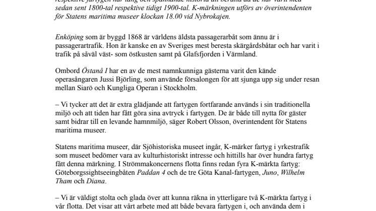 Stockholm får idag ytterligare två K-märka fartyg, de anrika skärgårdsbåtarna M/S Enköping och M/S Östanå I, båda tillhörande Strömma Kanalbolagets flotta. De respektive fartygen har lång och spännande historia att berätta då de har varit med sedan sent 1800-tal respektive tidigt 1900-tal. K-märkningen utförs av överintendenten för Statens maritima museer klockan 18.00 vid Nybrokajen.