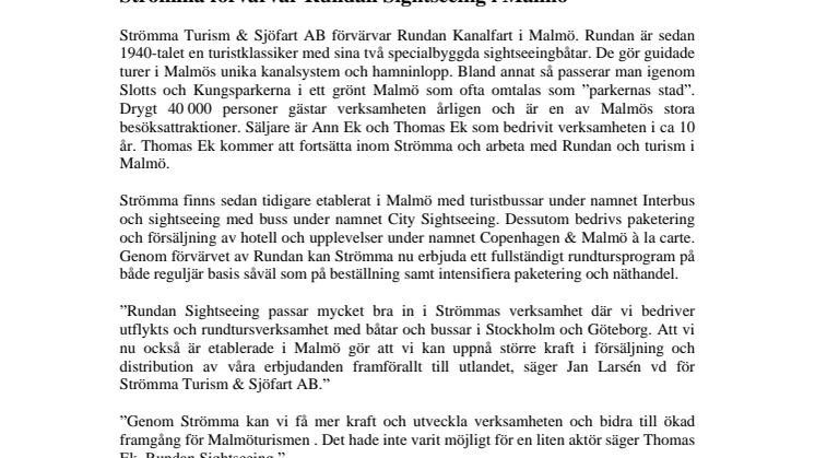 "Rundan Sightseeing passar mycket bra in i Strömmas verksamhet där vi bedriver utflykts och rundtursverksamhet med båtar och bussar i Stockholm och Göteborg. Att vi nu också är etablerade i Malmö gör att vi kan uppnå större kraft i försäljning och distribution av våra erbjudanden framförallt till utlandet, säger Jan Larsén vd för Strömma Turism & Sjöfart AB."