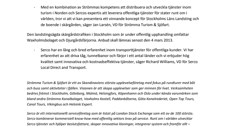 Strömma Turism & Sjöfart och engelska Serco Group har tecknat ett samarbetsavtal och kommer att lämna ett gemensamt anbud om skärgårdstrafiken i Stockholm. De två företagen bildar ett gemensamt bolag som kommer att lämna anbud och även driva verksamheten efter en lyckad upphandling.