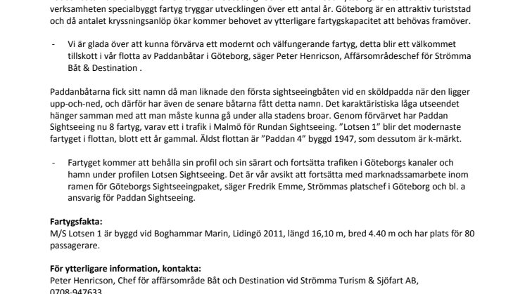 - Fartyget kommer att behålla sin profil och sin särart och fortsätta trafiken i Göteborgs kanaler och hamn under profilen Lotsen Sightseeing. Det är vår avsikt att fortsätta med marknadssamarbete inom ramen för Göteborgs Sightseeingpaket, säger Fredrik Emme, Strömmas platschef i Göteborg och bl. a ansvarig för Paddan Sightseeing.