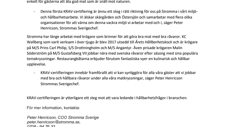 - Denna första KRAV-certifiering är ännu ett steg i rätt riktning för oss på Stromma i vårt miljö- och hållbarhetsarbete. Vi älskar skärgården och Östersjön och samarbetar med flera olika organisationer för att värna om denna vackra miljö vi arbetar med och i, säger Peter Henricson, Strommas Sverigechef.