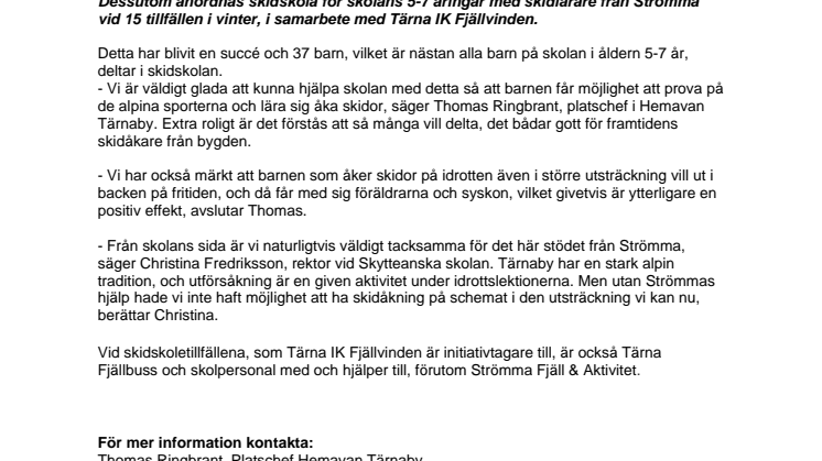 Vid skidskoletillfällena, som Tärna IK Fjällvinden är initiativtagare till, är också Tärna Fjällbuss och skolpersonal med och hjälper till, förutom Strömma Fjäll & Aktivitet.