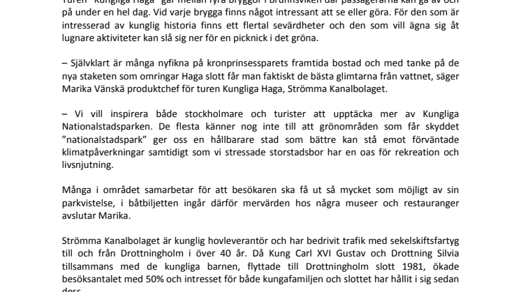 – Självklart är många nyfikna på kronprinsessparets framtida bostad och med tanke på de nya staketen som omringar Haga slott får man faktiskt de bästa glimtarna från vattnet, säger Marika Vänskä produktchef för turen Kungliga Haga, Strömma Kanalbolaget.