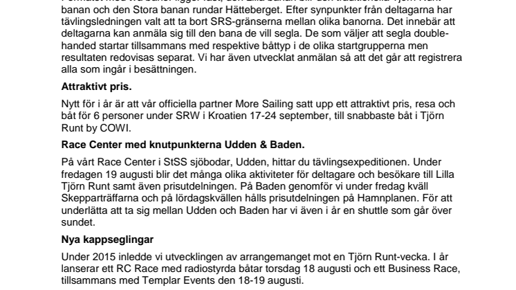 Formatet med två banor ligger fast, den Lilla banan blir den traditionella Tjörn Runt-banan och den Stora banan rundar Hätteberget. Efter synpunkter från deltagarna har tävlingsledningen valt att ta bort SRS-gränserna mellan olika banorna. Det innebär att deltagarna kan anmäla sig till den bana de vill segla. De som väljer att segla double-handed startar tillsammans med respektive båttyp i de olika startgrupperna men resultaten redovisas separat. Vi har även utvecklat anmälan så att det går att registrera alla som ingår i besättningen.