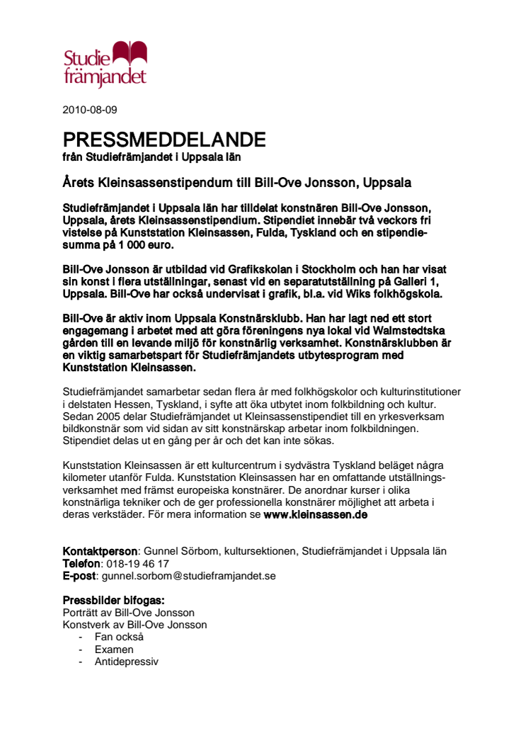Studiefrämjandet i Uppsala län har tilldelat konstnären Bill-Ove Jonsson, Uppsala, årets Kleinsassenstipendium. Stipendiet innebär två veckors fri vistelse på Kunststation Kleinsassen, Fulda, Tyskland och en stipendie-summa på 1 000 euro.