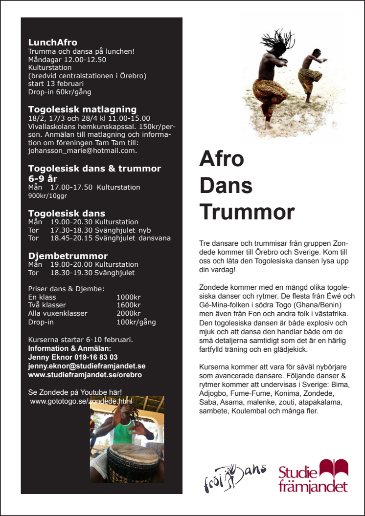 Tre Togolesiska dansare och musiker kommer till Örebro. De landar i Sverige på söndag och startar sina första dans- och trumgrupper på måndag 6/2. Under tre månaders tid kommer de att vara i Örebro och träffa dansare lokalt och regionalt och utbyta erfarenheter och undervisa. Det är dansföreningen Fröjdans och Studiefrämjandet som organiserar besöket.