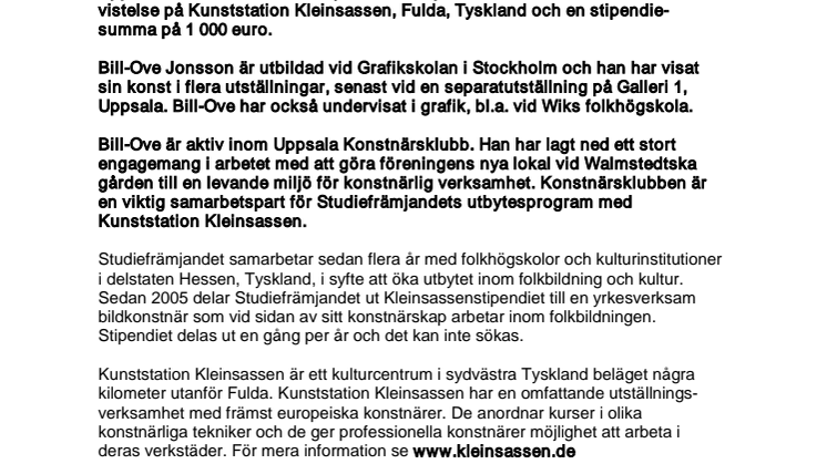 Studiefrämjandet i Uppsala län har tilldelat konstnären Bill-Ove Jonsson, Uppsala, årets Kleinsassenstipendium. Stipendiet innebär två veckors fri vistelse på Kunststation Kleinsassen, Fulda, Tyskland och en stipendie-summa på 1 000 euro.