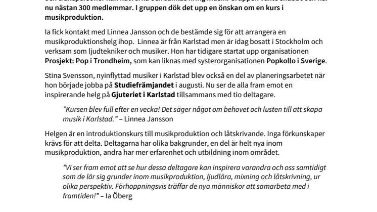”Kursen blev full efter en vecka! Det säger något om behovet och lusten till att skapa musik i Karlstad.” – Linnea Jansson