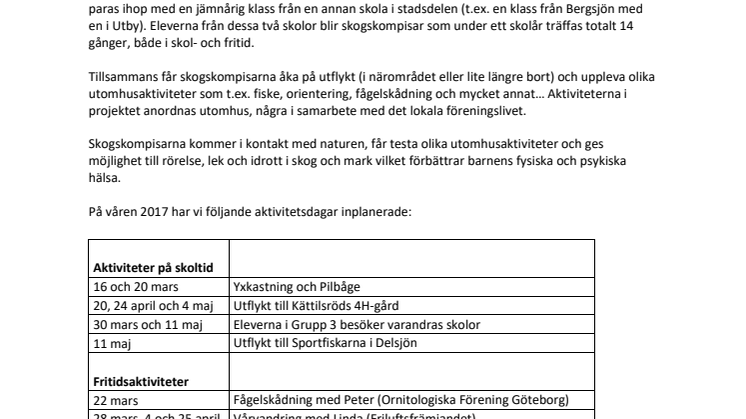 Tillsammans får skogskompisarna åka på utflykt (i närområdet eller lite längre bort) och uppleva olika utomhusaktiviteter som t.ex. fiske, orientering, fågelskådning och mycket annat… Aktiviteterna i projektet anordnas utomhus, några i samarbete med det lokala föreningslivet.