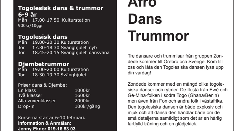 Under vistelsen i Sverige kommer de att undervisa i togolesisk traditionell dans och Djembetrummor samt hur man klär om en trumma och hur man tillverkar musikinstrumentet Assogoé av Kalebasser. Klasserna kommer att vara för de som dansat och trummat med Zondede förut men även för nybörjare som vill ha motion, musik, glädje och ny inspiration i vinterkylan.