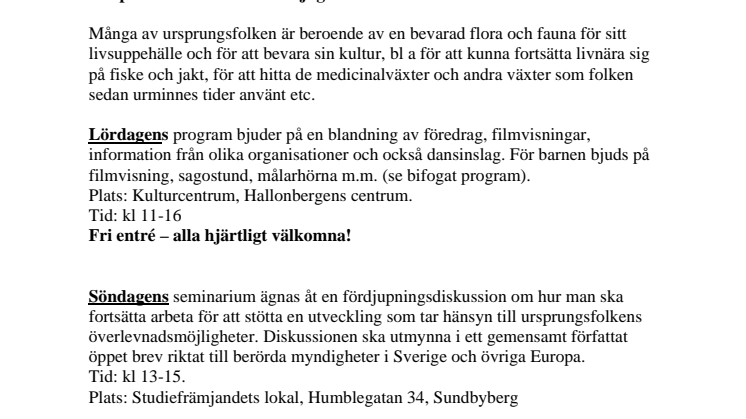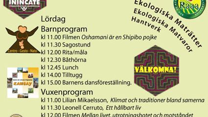 Lördagens program bjuder på en blandning av föredrag, filmvisningar, information från olika organisationer och också dansinslag. För barnen bjuds på filmvisning, sagostund, målarhörna m.m. (se bifogat program).