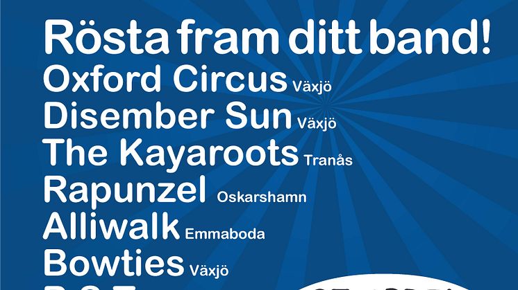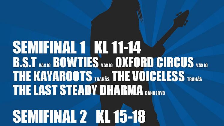 I helgen bestämde sig publik och jury vilka 8 band som ska gå vidare till Smålandsfinalen i Rockkarusellen den 25/4 på Palladium i Växjö. Det är ett enormt starkt startfält i år och en klar dominans av Växjöband, så räkna med en rafflande final.