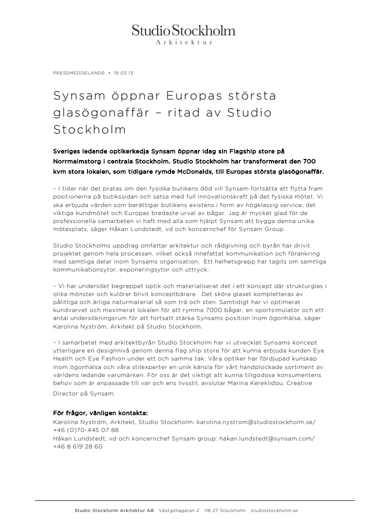 Sveriges ledande optikerkedja Synsam öppnar idag sin Flagship store på Norrmalmstorg i centrala Stockholm. Studio Stockholm har transformerat den 700 kvm stora lokalen, som tidigare rymde McDonalds, till Europas största glasögonaffär.