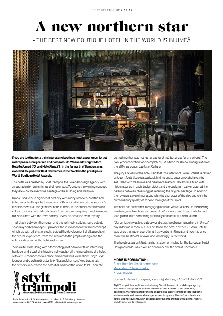 If you are looking for a truly interesting boutique hotel experience, forget metropolises, megacities and hotspots. Stora Hotellet Umeå (“Grand Hotel Umeå”), in the far north of Sweden, has been awarded the prize for Best Newcomer in the World in the prestigious World Boutique Hotel Awards.
