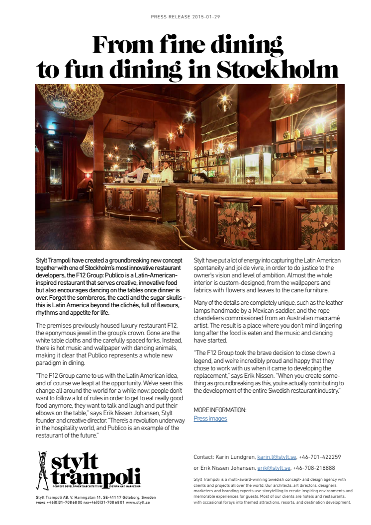 Stylt Trampoli have created a groundbreaking new concept together with the F12 Group, one of Stockholm’s most innovative restaurant developers: Publico is a Latin-American-inspired eatery with high culinary ambitions - a restaurant that serves creative, innovative food but also encourages dancing on the tables once dinner is over.
