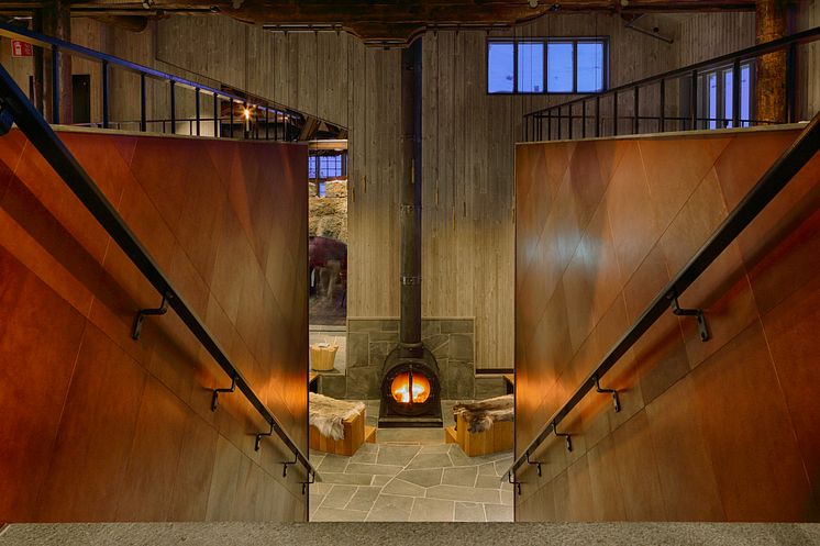 Brasan i receptionen. Niehku Mountain Villa består av 14 ombonade dubbelrum, restaurang, bar, vardagsrum och relaxavdelning, en kompromisslös byggnad med personlig, familjär och avslappnad stämning. Stylt som ligger bakom koncept, inredningsdesign och grafisk profil, är sedan länge experter inom upplevelseindustrin och har arbetat med en rad alpina hotellprojekt i bl.a. Gstaad, Val Thorens, Chamonix och i kanadensiska Canmore. Byggnaden har ritats av Krook & Tjäder.