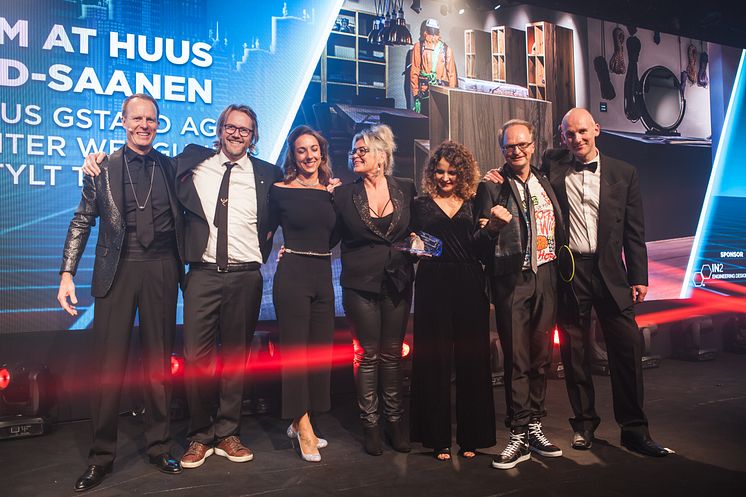 The double win at AHEAD, the Awards for Experience and Design, is the reward for Stylt’s work on the concept, interior design and graphic design of Huus Hotel in Swiss Gstaad. Left: Guy Dittrich, Erik Nissen Johansen, Mirka Czybik, Madeleine Johansson, Alexandra Lebelle, Gunter Weilguni.
