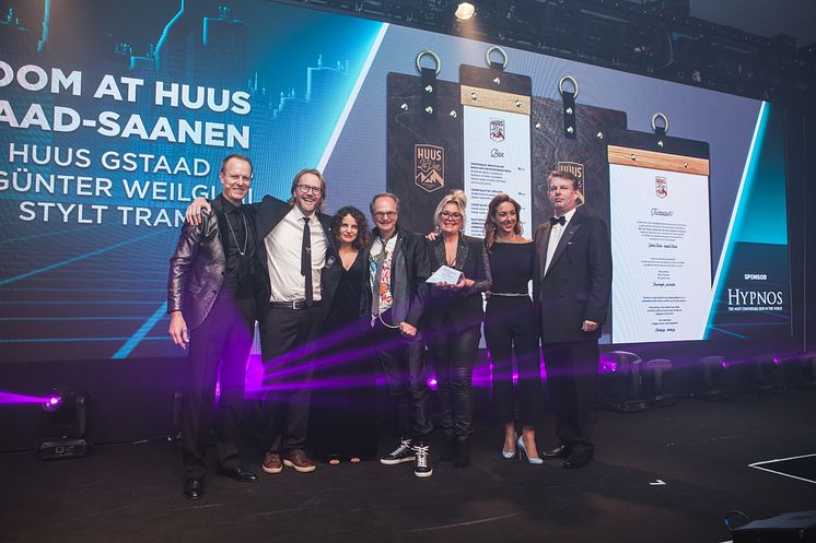 The double win at AHEAD, the Awards for Experience and Design, is the reward for Stylt’s work on the concept, interior design and graphic design of Huus Hotel in Swiss Gstaad. Left: Guy Dittrich, Erik Nissen Johansen, Alexandra Lebelle, Gunter Weilguni, Madeleine Johansson, Mirka Czybik.
