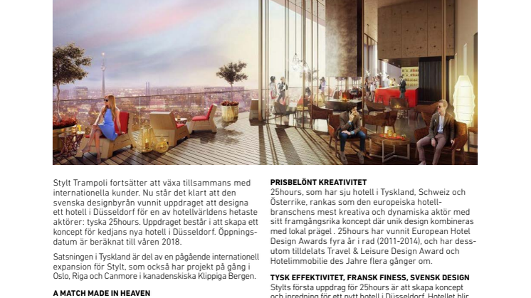 Stylt Trampoli fortsätter att växa tillsammans med internationella kunder. Nu står det klart att den svenska designbyrån vunnit uppdraget att designa ett hotell i Düsseldorf för en av hotellvärldens hetaste aktörer: tyska 25hours. Uppdraget består i att skapa ett koncept för kedjans nya hotell i Düsseldorf. Öppningsdatum är beräknat till våren 2018.