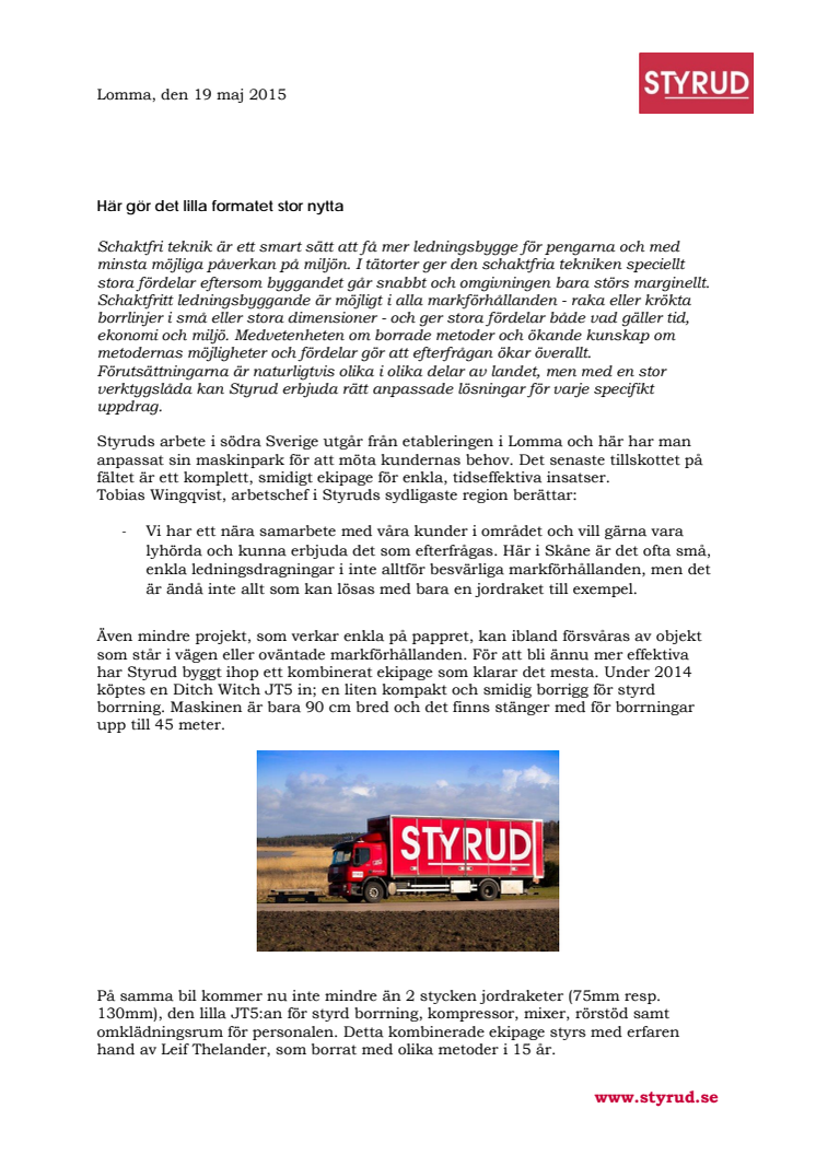 Det är mycket på gång i Sydsverige och i Malmöregionen i synnerhet. Det byggs som aldrig förr och Styrud anpassar sin maskinpark för att möta efterfrågan på effektivt ledningsbyggande. Schaktfri teknik är ett smart sätt att få mer ledningsbygge för pengarna och med minsta möjliga påverkan på miljön. Särskilt i tätort är schaktfritt att föredra - det går snabbt och omgivningen störs marginellt.