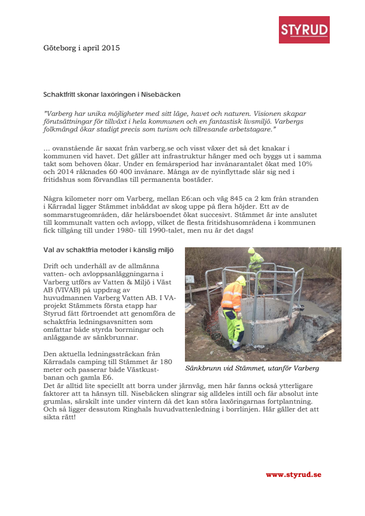 Norr om Varberg ligger Stämmet, ett sommarstugeområde med ökande helårsboende och därmed behov av anslutning till kommunalt vatten och avlopp. Den aktuella ledningssträckan från är 180 meter och passerar både Västkustbanan och gamla E6, men här fanns ytterligare faktorer att ta hänsyn till; bl a slingrar sig Nisebäcken som är lekplats för laxöringen alldeles intill och den får inte grumlas.