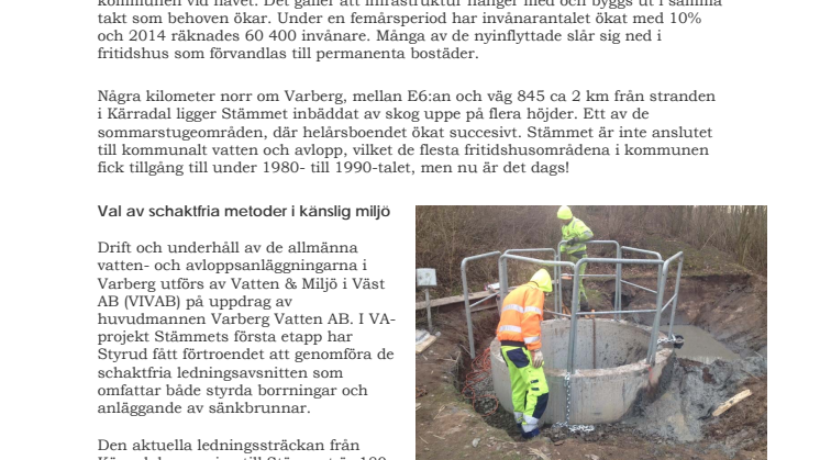 Drift och underhåll av de allmänna vatten- och avloppsanläggningarna i Varberg utförs av Vatten & Miljö i Väst AB (VIVAB) på uppdrag av huvudmannen Varberg Vatten AB. I VA-projekt Stämmets första etapp har Styrud fått förtroendet att genomföra de schaktfria ledningsavsnitten som omfattar både styrda borrningar och anläggande av sänkbrunnar.
