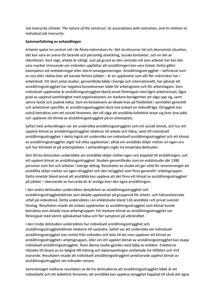 "Job insecurity climate: The nature of the construct, its associations with outcomes, and its relation to individual job insecurity", avhandling i sammanfattning.