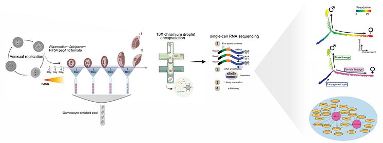 Schematisk översikt över de experimentella tillvägagångssätt som användes för att kartlägga uttrycket av flera viktiga genetiska regulatorer, det vill säga styrsystem, som finns längs utvecklingsbanan för malarias sexuella stadie i människan. Det stadiet kallas ”gametocytstadiet”.