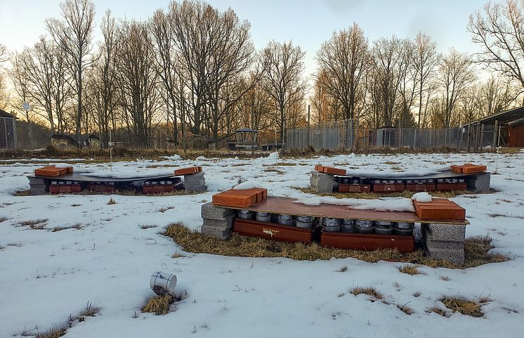 Vinterexperimentet vid Tovetorps forskningsstation, Stockholms universitet. Larverna övervintrade i burkar täckta med en plywoodskiva som skydd mot regn och snö.