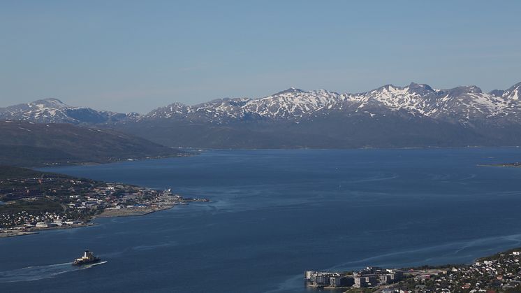 Oden lämnar Tromsöfjorden på väg till Arktiska Oceanen.
