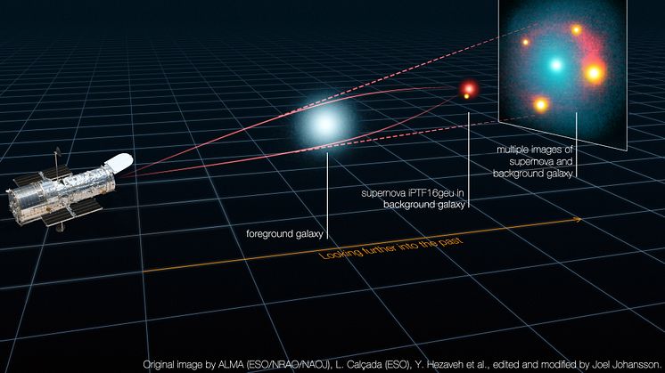 En internationell forskargrupp under ledning av Ariel Goobar vid Stockholms universitet kan för första gången visa bilder från en Typ Ia-supernova, där ljuset är kraftigt fokuserat av krökningen från gravitationen kring en galax i siktlinjen. Observationerna visar på en lovande ny teknik för att testa teorier för universums accelererande expansion, om gravitationen och om fördelningen av mörk materia i universum.