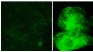 Bilden visar en flourescensmikroskopbild på brunfettsceller. Cellerna har färgats för att glukostransportör 1 (GLUT1) (grönt). Genom att undersöka hur glukostransportörer flyttas ifrån insidan till utsidan av brunfettsceller vid stimulering har den nya signalvägen kunnat karakteriseras. Vänster: Ostimulerade brunfettsceller. Höger: Stimulerade brunfettsceller där glukos går in med hjälp av glukostransportörer (grönt).