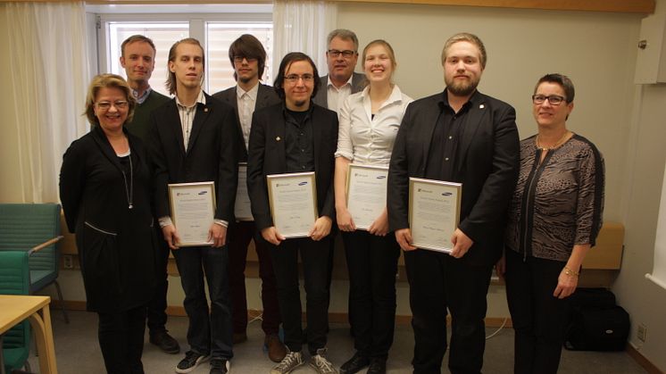 Prisutdelning Kinect Game Awards. Lena Gerholm, prorektor vid Stockholms universitet, David Söderström, handledare, Institutionen för data- och systemvetenskap, Björn Fyrfall, Erik Geidemark och Jesper Norberg, studenter vid Institutionen för data- och systemvetenskap, Pär Sveen, Vice President IT och Telecom hos Samsung, Tove Brantberg och Daniel Kihlgren Kallander, studenter vid Institutionen för data- och systemvetenskap och Marie Ygge, affärschef offentlig sektor på Microsoft.