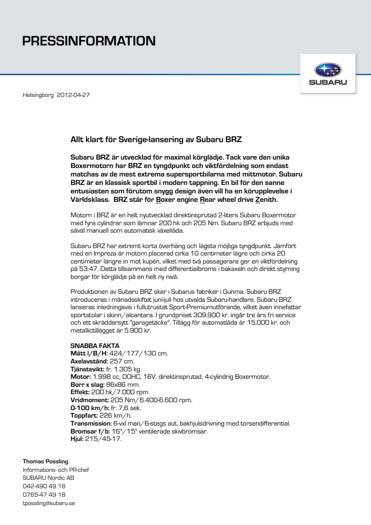 Allt klart för Sverige-lansering av Subaru BRZ