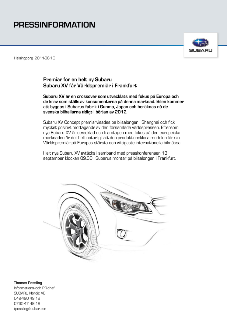 Subaru XV är en crossover som utvecklats med fokus på Europa och de krav som ställs av konsumenterna på denna marknad. Bilen kommer att byggas i Subarus fabrik i Gunma, Japan och beräknas nå de svenska bilhallarna tidigt i början av 2012.