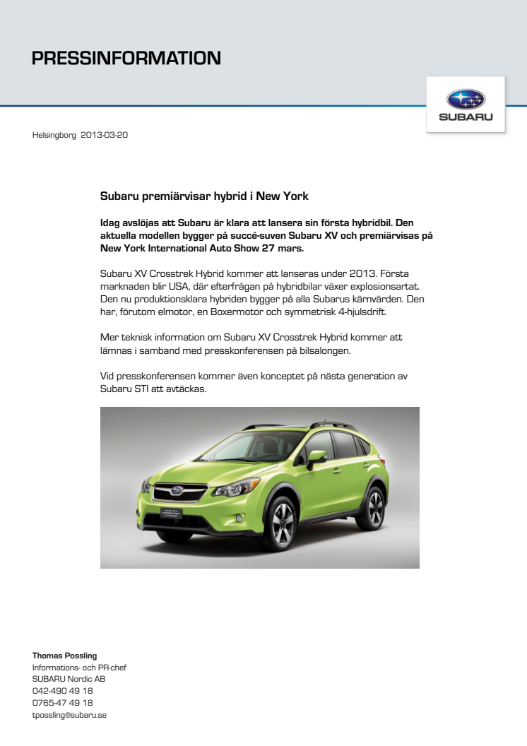 Idag avslöjas att Subaru är klara att lansera sin första hybridbil. Den aktuella modellen bygger på succé-suven Subaru XV och premiärvisas på New York International Auto Show 27 mars.