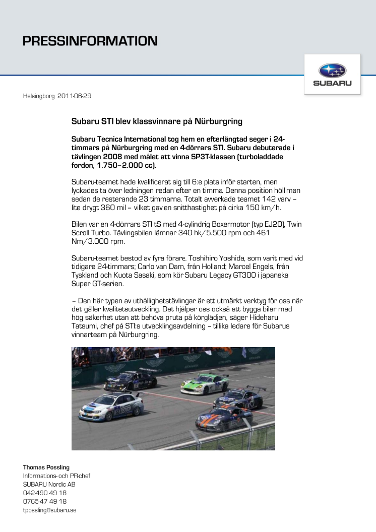 Subaru Tecnica International tog hem en efterlängtad seger i 24-timmars på Nürburgring med en 4-dörrars STI. Subaru debuterade i tävlingen 2008 med målet att vinna SP3T-klassen (turboladdade fordon, 1.750–2.000 cc).