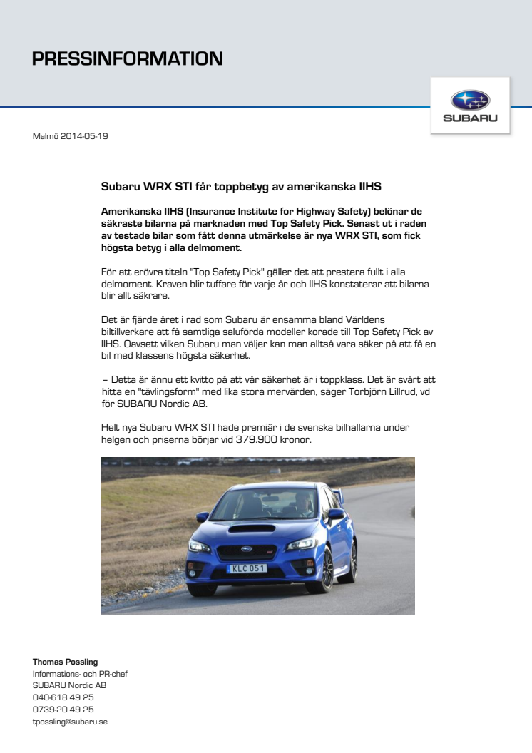 Amerikanska IIHS (Insurance Institute for Highway Safety) belönar de säkraste bilarna på marknaden med Top Safety Pick. Senast ut i raden av testade bilar som fått denna utmärkelse är nya WRX STI, som fick högsta betyg i alla delmoment.