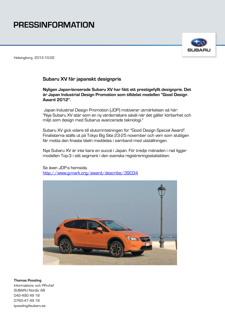 Nyligen Japan-lanserade Subaru XV har fått ett prestigefyllt designpris. Det är Japan Industrial Design Promotion som tilldelat modellen "Good Design Award 2012".