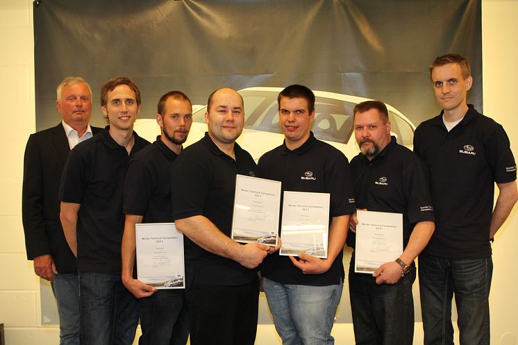 Finalfältet i SUBARU Nordic Technical Challenge 2011. Fr.v. Rolf Björkman, servicemarknadsdirektör, SUBARU Nordic AB; Martin Sävås, utbildningsansvarig på teknisk support, SUBARU Nordic AB; Kristoffer Frieberg, Autotjänst i Borlänge; Jonas Veršickas, JMA Centras i Vilnius; Heiki Riivik, Mariine Auto i Tallinn; Teemu Satomaa, Metro Auto i Espoo samt Niklas Gustavsson, servicechef SUBARU Nordic AB.